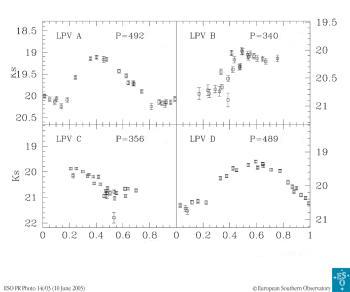 Curvas de luz de 4 variáveis do tipo Mira. Note-se a variação da magnitude a 2,2 mícron (banda Ks no infravermelho próximo) em função da fase de pulsação (uma fase de 0,5 corresponde a meio período). Uma diferença de 1 magnitude equivale a uma variação de brilho de 2,5 vezes. Para cada caso, o período (P) indicado está expresso em dias. Crédito: European Southern Observatory (ESO).