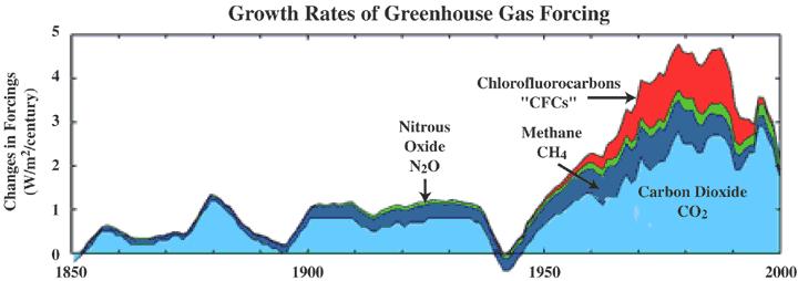 , mostra que o aumento do efeito estufa originado pela emissão de gases diminuiu desde o seu pico em 1980, devido parcialmente a acordos internacionais que reduziram a utilização de clorofluorcarbonetos, ao crescimento mais vagaroso das emissões de metano e à manutenção das emissões de dióxido de carbono.