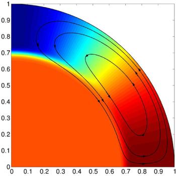Perfil transversal da circulação meridional do Sol. Esta circulação ocorre na zona convectiva do Sol (a camada mais externa com cerca de 30% do raio do Sol). A circulação, à superfície, faz-se em direcção aos pólos, enquanto que na base da zona convectiva, faz-se em direcção ao equador. A velocidade da circulação no fundo determina o período de 11 anos do ciclo das manchas solares, assim como a força de ciclos futuros. As cores na imagem indicam a velocidade de rotação das diferentes regiões: vermelho para rotação rápida com período de 25 dias, laranja para rotação média com período de 27 dias e azul para rotação lenta com rotação em 35 dias. Crédito: Dibyendu Nandy (Montana State University).
