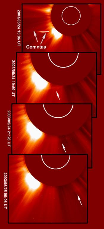 ). No entanto, é raro observar-se um par de cometas rasantes. Mais raro ainda é observar-se o que estas fotografias obtidas pelo SOHO mostram: parece que uma cauda, muito débil, continua a trajectória do cometa depois do ponto de maior aproximação da órbitaA Agência Espacial Europeia foi fundada em 1975 e actualmente conta com 15 países membros, incluindo Portugal.