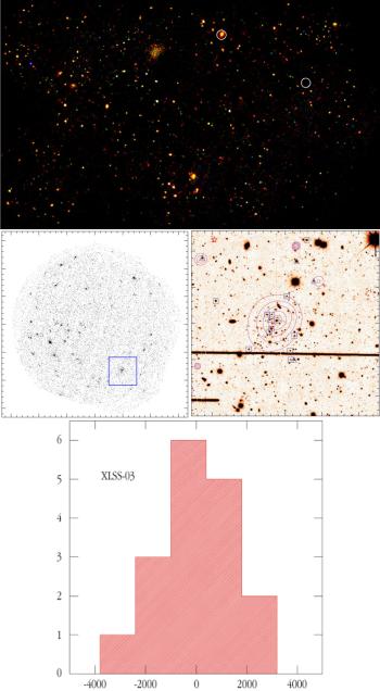 Em cima: a primeira imagem obtida pelo XMM-LSS Survey, composta por 14 frames individuais, cobre uma área no céu 8 vezes superior à Lua cheia, e contém 25 aglomerados de galáxias. Os círculos indicam os aglomerados anteriormente identificados em 1991 pelo ROSAT All-Sky Survey. No meio à esquerda: localização (assinalada pelo quadrado) de um possível aglomerado. No meio à direita: contornos da emissão em raios-X do aglomerado identificado à esquerda sobreposta numa imagem obtida pelo CFHT. Em baixo: distribuição de velocidades (expressas em km/s) das galáxias desse aglomerado, designado por XLSS-03.