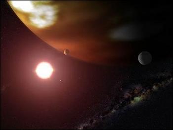 Visão artística de planetas extrasolares e do seu sol. Ao fundo, e em baixo, pode ver-se o centro da Via Láctea. Crédito: NASA e G. Bacon (STScI).