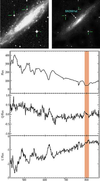 Em cima: Imagens da galáxia NGC 1448 antes (à esquerda) e depois (à direita) da explosão de supernova. Para fácil referência, três estrelas visíveis no campo estão assinaladas a verde em ambas as imagens. Crédito: StScI & ESO. Em baixo: Espectro da supernova SN2001el (em cima), e fracção de polarização da luz (ao meio e em baixo) para duas direcções (ou planos) perpendiculares entre si, entre 450 e 850 nanometros. A zona sombreada indica a assinatura espectral de material de alta velocidade nas camadas em expansão. Crédito: ESO.