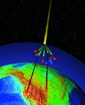 Um raio cósmico, neste caso um protão (a amarelo), atinge a alta atmosfera e produz uma chuva de outras partículas, a maior parte piões (a verde), que decaem para muões (a vermelho). Apenas uma pequena fração destes muões atingem a superfície da Terra. Crédito: SLAC - Universidade de Stanford, EUA.