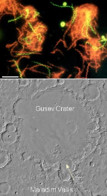 Em cima: Fotografia microscópica da Spirochaeta americana. As espirais a vermelho representam células mortas, enquanto as verdes são células vivas. Crédito: Richard B. Hoover, Elena Pikuta and Asim Bej, NASA/NSSTC University of Alabama at Huntsville, and the University of Alabama at Birmingham. Em baixo: Imagem da cratera Gusev e do vale Ma\'adim em Marte, obtida in 1998 pela Mars Global Surveyor (NASA). A seta indica a direcção provável de um hipotético escoamento de água líquida para o interior da cratera. Crédito: NASA.