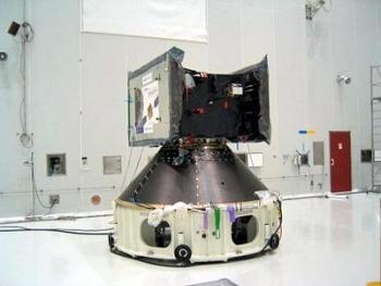 A SMART-1 já no seu adaptador de lançamento. Esta missão da ESA tem como objectivo, não só testar tecnologia de ponta que mais tarde será utilizada em missões de longo alcance, mas também realizar estudos científicos da Lua. Crédito: ESA.