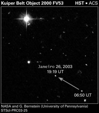 Duas imagens obtidas pelo Hubble com 12 horas de diferença foram combinadas para produzirem esta imagem de um objecto da Cintura de Kuiper a mover-se no céu. Os três objectos agora descobertos pelo Hubble são até 100 vezes menos brilhantes do que este objecto. Na verdade, nem são detectáveis pelo olho humano nas imagens do Hubble, necessitando de análise computacional para serem descobertos. Crédito: NASA, G. Bernstein & D. Trilling (University of Pennsylvania).