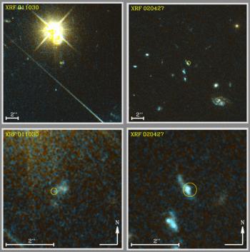 O Hubble observou, pela primeira vez, duas galáxias donde provieram dois flashes de raios-X. As galáxias parecem muito pequenas nas imagens porque se encontram entre 6 a 11 mil milhões de anos-luz de distância. O painel inferior mostra as galáxias em detalhe e os círculos representam as posições obtidas pelo Chandra do resplendor em raios-X dos XRF. Crédito: NASA/P. van Dokkum (Yale) & J. Bloom (CfA).