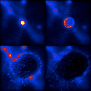 Ilustração da simulação da explosão, como supernova, de uma estrela da primeira geração do Universo. As simulações mostraram que as primeiras supernovas espalharam quantidades significativas de elementos pesados, tais como o ferro, o carbono e o oxigénio, ao longo de milhares de anos-luz no espaço. Crédito: V. Bromm (CfA), N. Yoshida (NAO Japan), L. Hernquist (CfA) & C. Lafon (CfA).