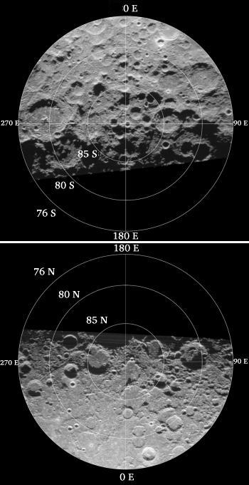 aparece apenas 2 graus acima do horizonte, de forma que a luz solar nunca penetra nas crateras mais profundas. O radar de Arecibo sondou o solo de duas crateras profundas, no pólo Sul da Lua, que permanecem sempre na sombra: Shoemaker e Faustini. E no pólo Norte, sondou o solo de Hermite e de várias crateras pequenas na zona da grande cratera Peary.