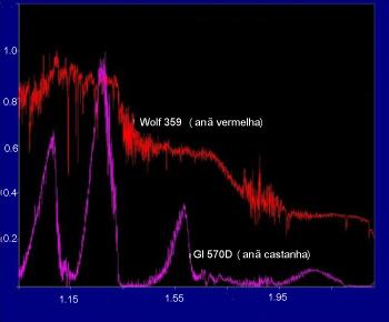 Comparação dos espectros no infravermelho próximo (entre 1 e 2 mícrones) de uma anã vermelha fria (Wolf 359, a vermelho) e da anã castanha Gl 570D (púrpura), que é muito mais fria, obtidos com o NIRSPEC. A diferença deve-se à presença de metano na atmosfera da anã castanha. A molécula de metano nunca se observa em estrelas normais porque estas são demasiado quentes. Observa-se contudo nos planetas exteriores do nosso Sistema Solar, e ainda em Titã, a maior lua de Saturno. Crédito: Keck Observatory.