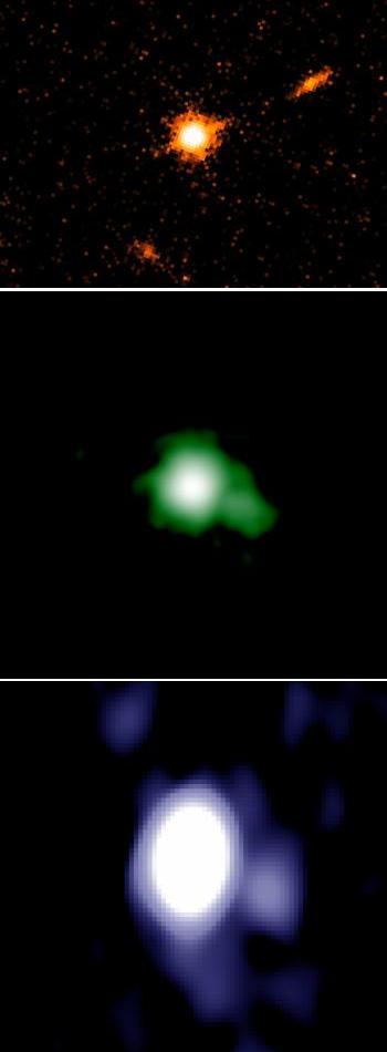 Uma outra equipa de investigação mostrou que, na emissão extensa em raios-X de GB1508+5714 (imagem do meio), uma parte significativa da energia é depositada nas regiões mais externas da própria galáxia. Esta energia pode ter um efeito importante na evolução desta galáxia, através da indução da formação de novas estrelas, ou ainda a inibição do crescimento da galáxia mediante acreção