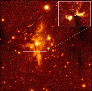 Imagem principal: imagem no infravermelho (banda K) do objecto estelar jovem IRAS 07427-2400, obtida com o UKIRT. Imagem pequena: a região central processada de modo a mostrar apenas o hidrogénio molécular quente que rodeia a estrela. Crédito: Nanda Kumar et al.
