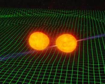 Imagem artística do pulsar J0737-3039 e da sua companheira. O sistema emite ondas gravitacionais aqui ilustradas como distorções numa grelha do espaço-tempo. Crédito: John Row.