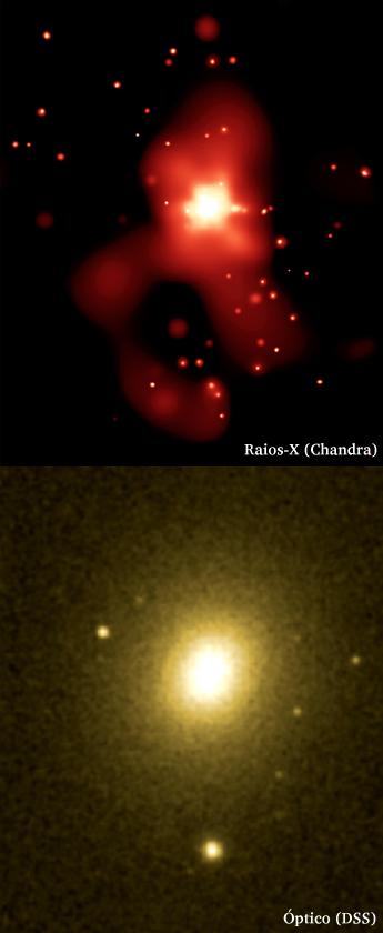 A galáxia elíptica NGC 4261 em raios-X pelo Chandra (em cima) e no óptico pelo Observatório do Monte Palomar (em baixo). Crédito: NASA/CXC/A. Zezas et al. (raios-X); Pal.Obs. DSS (óptico).