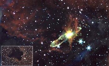 Imagem da estrutura Herbig-Haro 46/47 obtida pelo Spitzer Space Telescope. Os telescópios ópticos eram apenas capazes de detectar uma mancha opaca (canto inferior esquerdo). No infravermelho (imagem grande) a mesma estrutura revela actividade química e física nesta região de formação estelar. Crédito: NASA/JPL-Caltech.