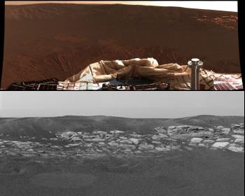 Em cima: imagem obtida com a câmara panorâmica do interior da cratera onde o rover Opportunity pousou. Este é o local de aterragem em Marte mais escuro de sempre. Em baixo: imagem de um afloramento rochoso onde se distinguem finas camadas de rocha. Crédito: NASA/JPL/Cornell.