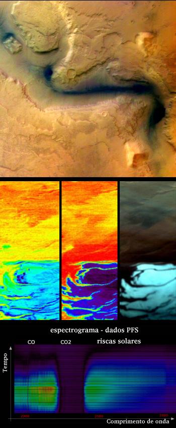 Em cima: imagem obtida pela câmara HRSC da bacia de Hellas (41°S e 101°E). A imagem cobre 100 km de extensão, com uma resolução de 12 m por pixel, e mostra o canal Reull Vallis, onde se julga que outrora correu água. Crédito: ESA/DLR/FU Berlim (G. Neukum). No meio: observações da calote polar do Sul realizadas pela OMEGA, em 3 bandas: à direita, no visível; ao centro, em gelo de dióxido de carbono; à esquerda, em gelo de água. Crédito: ESA/OMEGA. Em baixo: dados preliminares do espectrómetro PFS mostram que a distribuição de CO é diferente no hemisfério Norte e Sul de Marte. Crédito: ESA/PFS.