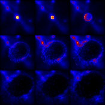Sequência de imagens da simulação da explosão de uma supernova da primeira geração. Os cálculos mostraram que estas supernovas eram extremamente energéticas e espalhavam no meio interestelar quantidades tremendas de elementos pesados como o ferro, o carbono e o oxigénio. O processo de enriquecimento químico do nosso Universo foi essencial para o aparecimento das estrelas de pequena massa e, mais tarde, para o aparecimento de planetas e da Vida. Crédito: Volker Bromm (CfA), Naoki Yoshida (National Astronomical Observatory of Japan), Lars Hernquist (CfA), and Christine Lafon (CfA).