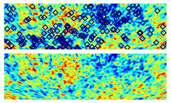 A imagem de cima mostra parte do mapa de temperatura obtido com o WMAP. Os quadrados assinalam as posições de aglomerados de galáxias próximos. Os aglomerados e superaglomerados de galáxias tendem a estar nas regiões mais frias (azuis). Servindo de referência, a imagem de baixo mostra o mesmo mapa mas sem as posições dos aglomerados. Crédito: Myers et al.; NASA/WMAP.