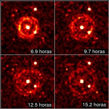 Os anéis parecem expandir-se porque os raios-X dispersos por poeira situada mais longe levam mais tempo a chegar do que aqueles que interagem com poeira mais próxima. Claro que nada se pode mover mais rápido que a luz. Na realidade, a taxa de expansão que observamos é apenas um efeito visual. Acontece que se vêem dois anéis porque existem dois finos mantos de pó entre nós e a fonte da fulguração de raios gama: um mais próximo, que cria o anel maior, e outro mais longe, onde se forma o anel mais pequeno.
