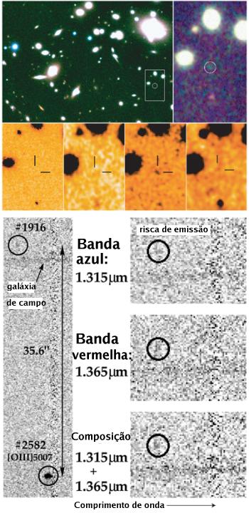 Em cima: imagens do centro do enxame de galáxias Abell 1835, obtidas pelo ISAAC; o círculo branco indica a localização da galáxia Abell 1835 IR1916. No meio: imagens da galáxia remota a diferentes comprimentos de onda; a primeira foi obtida na banda R (óptico) pelo Hubble e a galáxia não aparece; seguem-se imagens nas bandas J, H e K, obtidas pelo ISAAC, onde a galáxia já é detectada. Em baixo: espectros da galáxia Abell 1835 IR1916 na região próxima da risca de emissão a 1,33745µm. Se se tratar de facto da risca Lyα (0,1216µm), então a galáxia tem um desvio para o vermelho de 10. A risca foi observada em dois espectros independentes (à esquerda e à direita) correspondentes a duas montagens diferentes do espectrógrafo. Crédito: ESO.