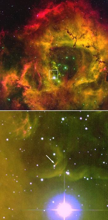 Em cima: A nebulosa da Roseta, também designada NGC 2237. A caixa marca a região que contém o jacto Rosette HH1. Em baixo: Imagem da região do jacto Rosette HH1, marcado com uma seta. Crédito: T. Rector, WIYN e NOAO/AURA/NSF.