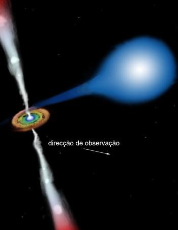 . Crê-se que estes jactos são produzidos à medida que a matéria do disco de acreçãoOs quasares são objectos extragalácticos extremamente brilhantes e compactos. Hoje acredita-se que são o centro de galáxias muito energéticas ainda num estado inicial da sua evolução (são, pois, núcleos galácticos activos - NGAs) e a sua energia provém de um buraco negro de massa muito elevada. Os seus desvios para o vermelho indicam que se encontram a distâncias cosmológicas. O seu nome, quasar, vem do inglês quasi-stellar object, ou seja, objecto quase estelar, devido à semelhança da sua imagem em placas fotográficas com a imagem de uma estrela.