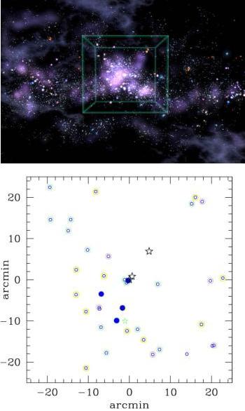 Em cima: Visão artística da cadeia de galáxias descoberta, sobreposta nas 37 galáxias detectadas (na região indicada pelo cubo). Em baixo: Diagrama das posições relativas das 37 galáxias detectadas neste estudo, em unidades de minutos de arco.Crédito: NASA.
