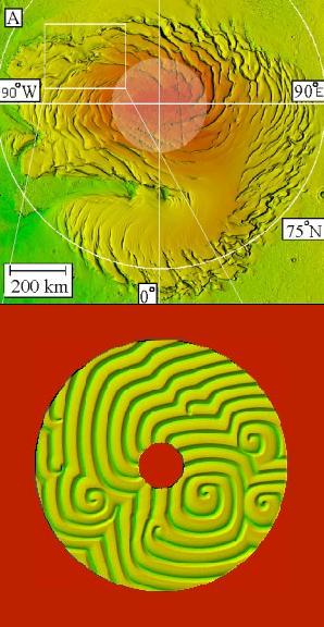 Este padrão invulgar foi visto pela primeira vez pela sonda Viking, em 1976. Os cientistas têm-no explicado utilizando teorias baseadas nos ciclos alternados de aquecimento e arrefecimento das calotes, cujos modelos incluem os efeitos do vento e do deslocamento das calotes de gelo. Agora, um novo modelo, apresentado por J. Pelletier (Universidade do Arizona em Tucson, EUA) na revista científica Geology, é capaz de reproduzir as espirais apenas com os ciclos de aquecimento e arrefecimento das calotes, isto é, sem necessidade de invocar efeitos do vento e do deslocamento das calotes.