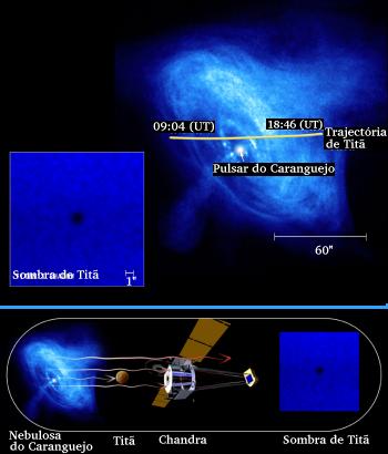 Em cima: a trajectória de Titã sobre o fundo da nebulosa do Caranguejo durante o trânsito de Janeiro de 2003 (note-se o quão perto Titã passou do centro da nebulosa); e a imagem da sombra de Titã em raios-X, obtida pelo Chandra. Crédito: NASA/CXC/Penn State/K.Mori et al. (trajectória de Titã); NASA/CXC/ASU/J.Hester et al. (nebulosa de Caranguejo). Em baixo: ilustração de como o Chandra observou a sombra de Titã em raios-X - a nebulosa do Caranguejo é uma fonte brilhante em raios-X de forma que Titã, ao passar à sua frente, faz sombra na imagem. Crédito: CXC/M. Weiss.