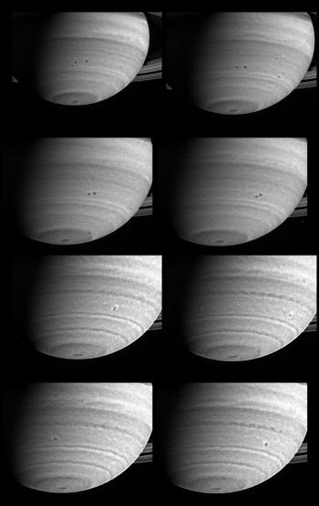 Estas 8 imagens de Saturno foram obtidas entre 22 de Fevereiro e 22 de Março de 2004, pela câmara ISS da sonda Cassini. As 4 primeiras exposições são no infravermelho próximo e cobrem um intervalo de 26 dias; duas tempestades são observadas a aproximarem-se uma da outra. As 4 últimas imagens são na banda do visível e foram obtidas em 19, 20, 21 e 22 de Março. Esta última sequência ilustra a evolução dos acontecimentos: logo a seguir à fusão, a 20 de Março, a nova tempestade tem uma forma alongada na direcção norte-sul, com nuvens brilhantes de ambos os lados; dois dias mais tarde, a sua forma é mais circular e as nuvens espalharam-se à sua volta, formando um halo. Crédito: NASA/JPL/Space Science Institute.