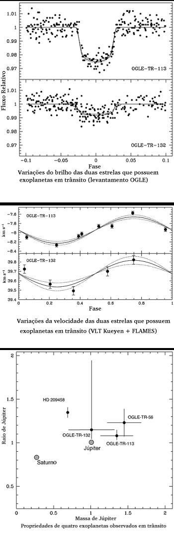 Em cima: curva de luz das estrelas OGLE-TR-113 e OGLE-TR-132, observadas pelo levantamento OGLE; a diminuição do brilho das estrelas deve-se ao trânsito de planetas gigantes gasosos; as variações no brilho são da ordem dos 3% para OGLE-TR-113 e de 1% para OGLE-TR-132. No centro: variações na velocidade radial observadas pelo FLAMES no telescópio Kueyen do VLT (ESO); a forma sinusoidal reflecte a acção gravitacional do planeta na estrela. Em baixo: massa e raio para os exoplanetas até hoje observados em trânsito. Crédito: ESO.