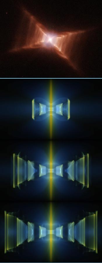 Em cima: as observações do Rectângulo Vermelho (HD 44179) realizadas pela câmara WFPC2 do Telescópio Espacial Hubble revelaram detalhes nesta nebulosa nunca antes vistos. Crédito: NASA/ESA, Hans Van Winckel (Catholic University of Leuven, Belgium) & Martin Cohen (University of California). Em baixo: simulação da formação da estrutura bicónica em degraus observada no Rectângulo Vermelho; a estrela central ejecta matéria que é afunilada por um toro de poeira que a rodeia (visto de perfil, é o traço amarelo vertical), dando origem a dois fluxos de matéria, em forma de cone, em sentidos opostos; as três imagens são uma sequência temporal com cerca de 600 anos de intervalo. Crédito: ESA & Vincent Icke (Leiden University, the Netherlands).
