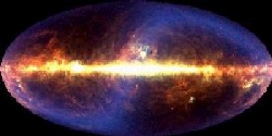 Imagem da nossa Galáxia, obtida pelo satélite COBE. A faixa azul que envolve e atravessa o centro da imagem é criada pelo disco de poeira que se encontra à volta do nosso Sistema Solar; a faixa brilhante horizontal no centro da imagem é criada pela poeira do disco da nossa Galáxia. Crédito: Michael Hauser (STScI), COBE/DIRBE e NASA.