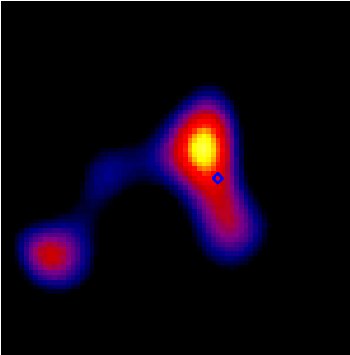 Imagem do disco de poeira à volta de Tau Ceti, obtida com o SCUBA. A falsa cor mostra o brilho do disco. O seu diâmetro é apenas ligeiramente maior do que o do Sistema Solar. Crédito: James Clerk Maxwell Telescope.