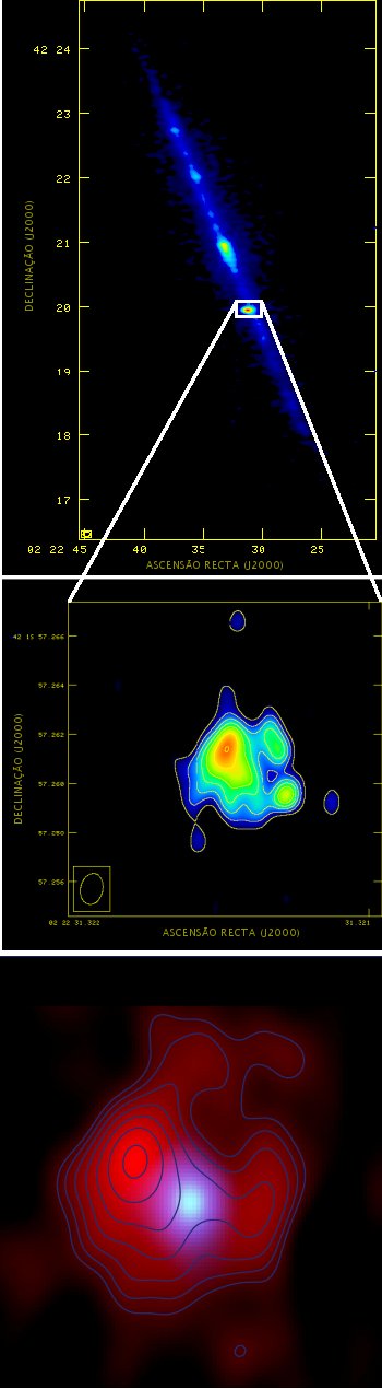 Em cima: imagem em rádio, obtida pelo VLA, da galáxia NGC 891, mostrando a explosão de supernova SN 1986J no centro da galáxia. No meio: detalhe da supernova, obtido com uma rede global de radiotelescópios. Em baixo: detalhe da supernova em diferentes frequências; as áreas a azul e branco mostram a nebulosa à volta do buraco negro, ou estrela de neutrões, no centro da supernova, a uma frequência de rádio mais elevada, de 15 GHz; a vermelho, assim como os contornos, vê-se à frequência de rádio mais baixa, de 5 GHz, a camada de material em expansão, lançado pela explosão da supernova. Crédito: Michael F. Bietenholz and Norbert Bartel, York University, Michael Rupen, NRAO, NRAO/AUI/NSF.