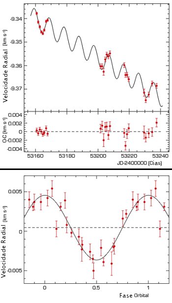 Em cima: variações da velocidade radial da estrela mu Arae. A linha preta mostra o melhor ajuste às medições realizadas com o HARPS (pontos vermelhos), assumindo a existência de dois planetas e um companheiro de longo período. Os dados foram obtidos durante um intervalo de tempo de 80 dias (os primeiros pontos são os dados das 8 noites de Junho). A parte de baixo do gráfico mostra o desvio das medições relativas ao melhor ajuste. Em baixo: curva da velocidade radial da estrela mu Arae mostrando o efeito do novo exoplaneta de período 9,5 dias, após as medições terem sido corrigidas para ter em conta o efeito dos outros dois companheiros. A semi-amplitude da curva é inferior a 5 m/s, o que, juntamente com o período orbital de 9,5 dias, implica um limite inferior para a massa do planeta de 14 vezes a massa da Terra. Crédito: ESO.
