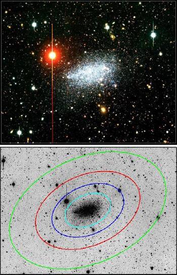Em cima: Galáxia irregular Leo A vista pelo telescópio japonês Subaru. Em baixo: Imagem na banda V (banda visual, a 0,55 mícrones) de Leo A, obtida pela câmara Suprime-Cam. As elipses sobrepostas na imagem representam os diferentes tamanhos estimados para Leo A: tamanho observado em estudos prévios (cian); tamanho para o qual o halo agora descoberto se torna proeminente (azul); o novo tamanho agora atribuído a Leo A (vermelho); região usada para contagem de estrelas de fundo para determinação da densidade superficial de estrelas (verde). Crédito: Subaru Telescope, National Astronomical Observatory of Japan (NAOJ).