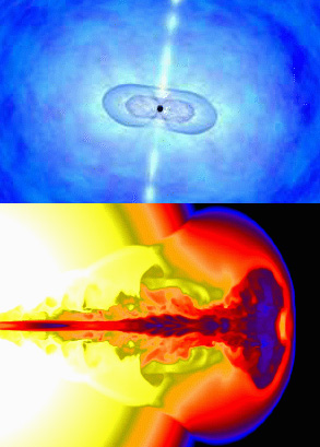 Em cima: Fulgurações de raios-gama emitidas pelo núcleo de uma estrela em colapso. Visão artística. Em baixo: Imagem, simulada por computador, da distribuição das partículas no jacto que sai da estrela; as cores amarela e laranja correspondem a partículas de energia muito elevada, responsáveis pela emissão dos raios gama; a azul, as partículas de menor energia espalham-se em ângulos maiores para fora do jacto, dando origem aos frequentes flashes de raios-X. Crédito: NASA.