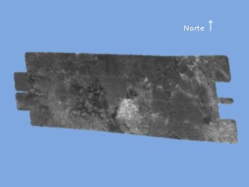 Imagem de radar de uma região de Titã no hemisfério norte, apelidada de “Si-Si, o Gato” devido a uma área escura que apresenta a forma de uma cabeça de gato. As áreas brilhantes correspondem a terreno mais duro, enquanto que as áreas escuras correspondem a terreno mais suave. Os pontos escuros interconectados são consistentes com um sólido muito suave, ou altamente absorvente, ou mesmo um líquido. A imagem tem cerca de 250 km x 478 km e cobre uma região ainda não observada com câmaras de radiação visível. As estruturas menores nesta imagem variam entre 300 m e 1 km. Crédito: NASA/JPL.