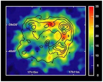 Imagem do remanescente de supernova RX J1713.7-3946, em radiação gama de alta energia. Sobreposto, para comparação, estão os contornos da emissão da radiação X observada com o satélite ASCA (Japão). Crédito: PPARC.