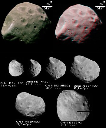 Em cima, à esquerda: Imagem de Fobos, mostrando o lado virado para Marte, tirada a uma distância de menos de 200 km, com a resolução de cerca de sete metros por pixel. Esta imagem foi obtida pela câmara HRSC a bordo da sonda Mars Express (ESA), durante a órbita 756, a 22 de Agosto de 2004. Em cima, à direita: Anáglifo 3D gerado por combinação de uma vista vertical e de canais de azul do HRSC. Em baixo: Fobos em diferentes orientações, tal como foi vista durante as órbitas 748, 413, 649, 682 e 715. Crédito: ESA/DLR/FU Berlin (G. Neukum).