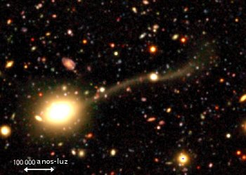 Imagem obtida pelo Telescópio Subaru testemunha canibalismo galáctico. A galáxia elíptica gigante, à esquerda, é COSMOS J100003+020146 e a pequena galáxia anã, que lhe está ligada por uma ténue faixa de estrelas, é COSMOS J095959+020206; uma segunda “cauda” de estrelas sai da galáxia anã para o lado oposto da galáxia elíptica, também resultante do efeito da gravidade da galáxia elíptica na galáxia anã. Crédito: Subaru Telescope/NAOJ/Y. Taniguchi (Univ. Tohoku) et al. 2004.