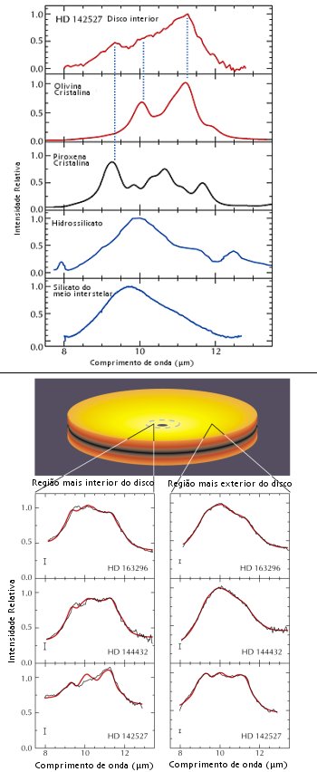 Em cima: espectro infravermelho da região mais interior do disco protoplanetário da estrela HD 142527, obtido com o VLTI. Seguem-se espectros infravermelhos, obtidos em laboratório, de minerais cristalinos (olivina e piroxena), um espectro de uma partícula do meio interplanetário, rica em silicatos hidratados, e, por fim, o espectro de grãos do meio interstelar. As assinaturas espectrais da olivina e piroxena cristalizadas (os picos a 9,2 e 11,3 µm) são evidentes no espectro da região interior do disco. Por outro lado, não há contribuição significativa de silicatos hidratados, indicando que a região interior é composta por poeira primária e não secundária. Em baixo: imagem esquemática do disco circum-estelar e os espectros infravermelhos observados nas regiões mais interiores e mais exteriores dos discos de três estrelas jovens. Em todos eles há claras diferenças entre as regiões interiores e as regiões exteriores, indicativas de diferenças em mineralogia. O alargamento espectral nas regiões mais internas dos discos é sinal de grãos maiores e o pico no comprimento de onda dos 11,3 µm indica a presença de cristais de silicatos. Também se mostra, a vermelho, os espectros teóricos que melhor se adaptam às observações, baseados em misturas das espécies minerais mencionadas. Crédito: ESO.