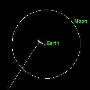 Diagrama que mostra a aproximação do asteróide 2004 MN4 à Terra em 2029. A ponta do traço azul mais próxima da Terra representa a posição mais provável do asteróide a 13 de Abril de 2029, e o traço branco, perpendicular ao azul, representa as posições alternativas para o asteróide nessa data. Em nenhum caso o asteróide colide com a Terra. Crédito: Paul Chodas/NASA/JPL.