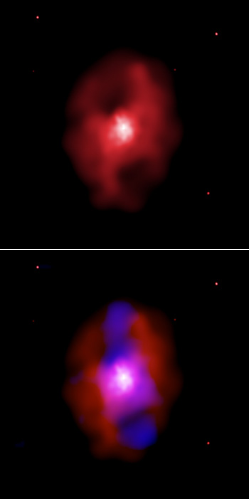 Em cima: esta imagem, obtida pelo Chandra, mostra as duas grandes cavidades (cada uma com 600 000 anos-luz de diâmetro) existentes no gás quente (vermelho), emissor de raios-X, que permeia o enxame de galáxias MS 075.6+7421. Em baixo: imagem que compara os dados de raios-X obtidos pelo Chandra com os de rádio (azul), obtidos pelo VLA. As cavidades formaram-se devido a jactos de partículas de alta energia magnetizadas, que empurraram o gás. Crédito: X-ray: NASA/CXC/Ohio U./B.McNamara et al.; Radio: NRAO/VLA)