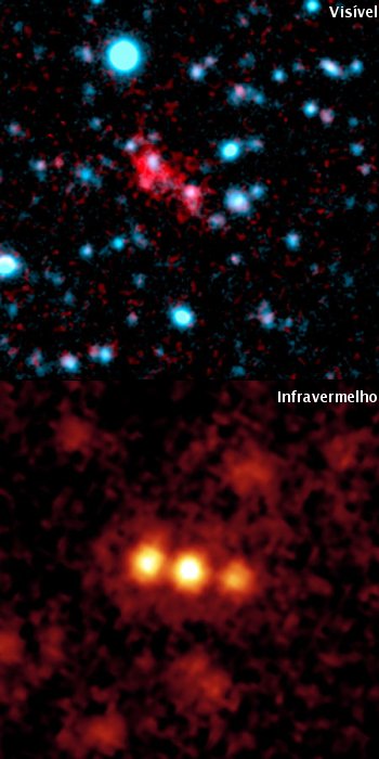 Duas imagens do enxame de galáxias J2143-4423. Em cima: imagem no visível, obtida pelo Telescópio Blanco de 4m, do CTIO, onde se observa um blob gigante (vermelho). Crédito: CTIO/P. Palunas. Em baixo: imagem no infravermelho, obtida pelo Telescópio Espacial Spitzer, mostrando três galáxias em fusão dentro do blob. Crédito: NASA/JPL-Caltech/H. Teplitz (SSC/Caltech).