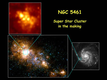 Em baixo, à direita: uma imagem da galáxia espiral M101, do Sky Survey do Segundo Observatório Palomar. A caixa marca a localização de NGC 5461. Em baixo, à esquerda: uma imagem em cor falsa de NGC 5461 construída a partir de imagens obtidas pelo Hubble. As estrelas jovens e os enxames surgem predominantemente a azul, enquanto o gás interestelar ionizado surge a vermelho. Em cima: a imagem dos três enxames de estrelas no coração de NGC 5461, obtida pelo Hubble. Crédito: NASA, Y.-H. Chu and R. Chen (UI), and K. Johnson (University of Virginia).
