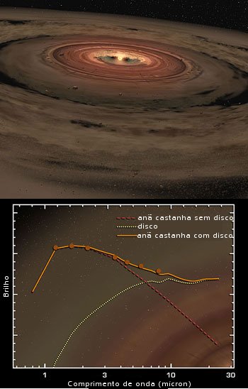 Em cima: Uma visão artística de uma anã castanha rodeada por um disco de formação de planetas. Crédito: NASA/JPL-Caltech/T. Pyle (SSC). Em baixo: O Spitzer observou o disco de formação planetária medindo a radiação emitida no infravermelho. O gráfico mostra que, enquanto uma anã castanha sem disco (linha vermelha a tracejado) emite radiação infravermelha em comprimentos de onda mais pequenos, uma anã castanha com disco (linha laranja) emite um excesso de radiação infravermelha em comprimentos de onda maiores, que é devido ao próprio disco (linha amarela). Crédito: NASA/JPL-Caltech/Harvard-Smithsonian CfA.